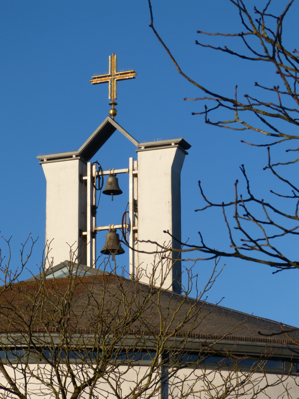 In einem offenen Glockenstuhl über dem Kirchendach, sichtbar aus dem Kirchenraum, hängen zwei Glocken übereinander. Die katholische Glocke ist dem Rottaler Heiligen Bruder Konrad geweiht, die evangelische Glocke dem Reformator Dr. Martin Luther. Beide Glocken, gegossen von der Firma Perner aus Passau, laden gemeinsam zu den Gottesdiensten ein - geeinte Verschiedenheit beider Konfessionen.