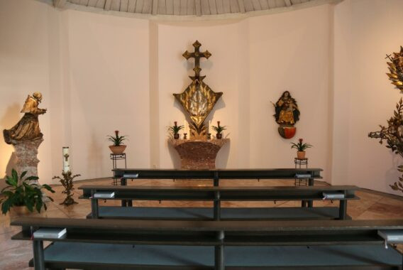 Im Folgenden stellen wir Ihnen die Kirche vor. Aber am besten, Sie sehen sich dieses besondere Gebäude vor Ort selbst an! Wir bieten regelmäßig Kirchenführungen an. Außerdem liegen in der Kirche Flyer mit architektonischen Hinweisen bereit.